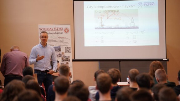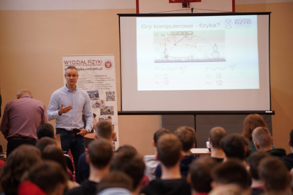 Dr Krzysztof Gawryluk z Wydziału Fizyki opowiadał o grach komputerowych i robotach, ale …w ujęciu interdyscyplinarnym. Uczniowie mogli dowiedzieć się m.in. jak tworzy się gry, dlaczego potrzebna jest do tego nie tylko znajomość informatyki, ale również wiedza z zakresu matematyki i fizyki.