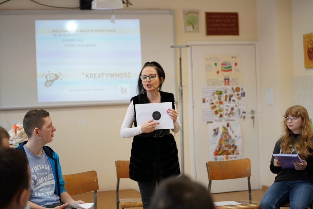 Marcelina Wojno z Biura Karier zaprosiła młodzież do świata kreatywności. Podczas warsztatu „Wyginaj śmiało umysł” uczniowie dowiedzieli się m.in. dlaczego czasem warto porzucić myślenie schematyczne i jak kreatywność pomaga w uczeniu się, zapamiętywaniu i rozwiązywaniu problemów.