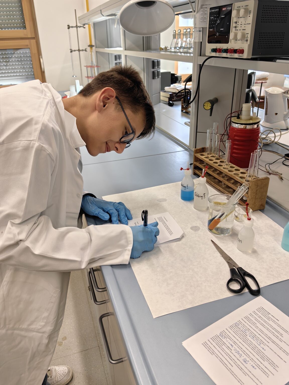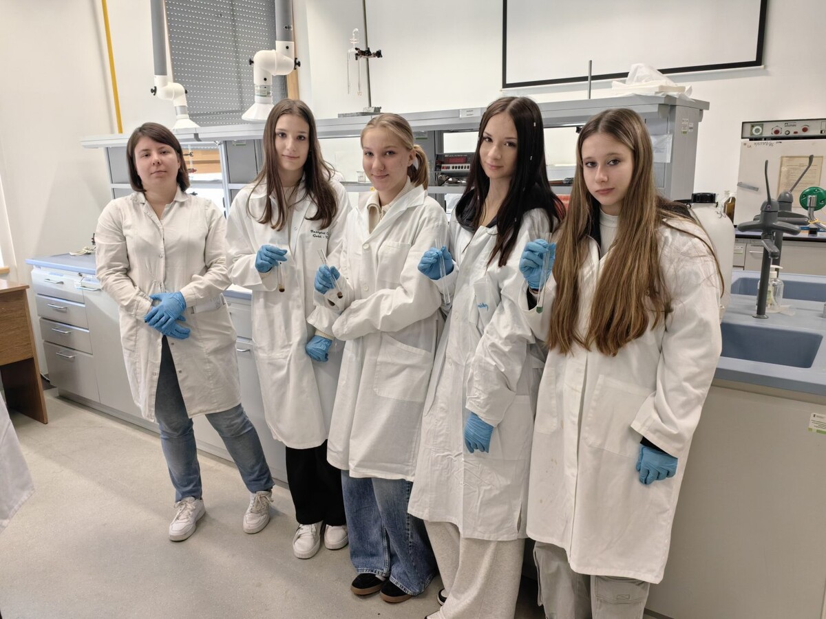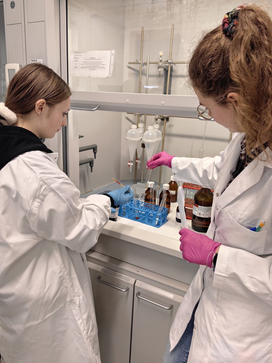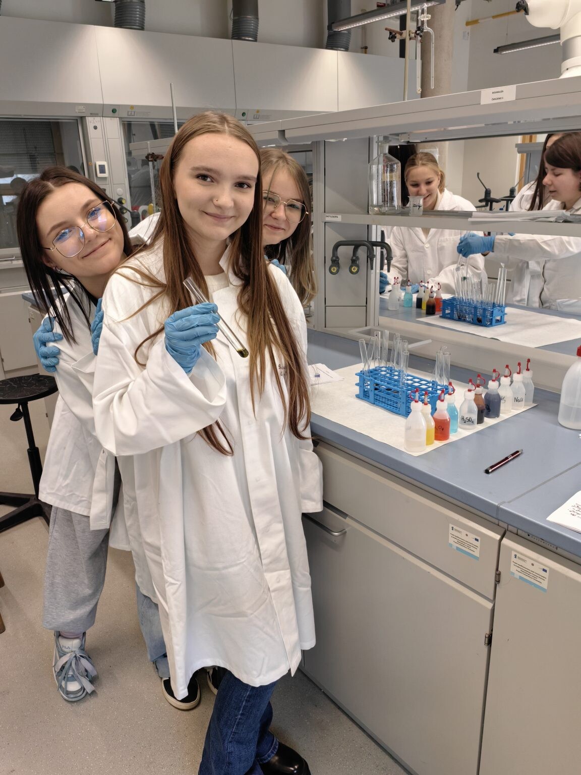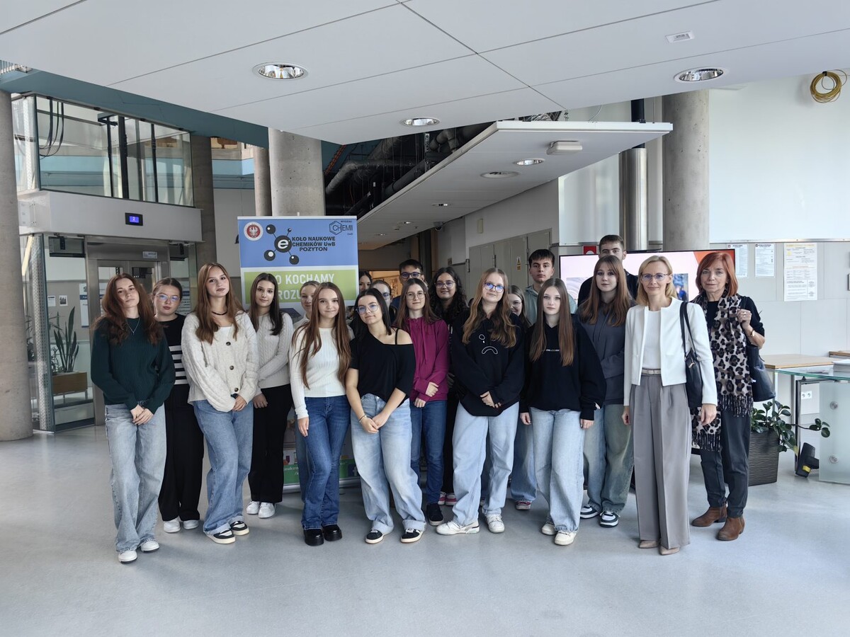 Na Wydziale Chemii Uniwersytetu w Białymstoku, w ramach cyklu „Spotkań u Chemików” 5 listopada 2024 roku, gościli uczniowie z I Liceum Ogólnokształcącego im. Adama Mickiewicza w Kolnie. Młodzież (około 20 osób) uczestniczyła w warsztatach laboratoryjnych, zorganizowanych przez Panią dr hab. Izabelę Dobrzyńską, prof. UwB, Panią dr Annę Sankiewicz oraz studentów II roku II stopnia kierunku Chemia. Uczniowie własnoręcznie i z dużym zainteresowaniem, wykonywali zaplanowane dla nich doświadczenia, dotyczące badania związków pierwiastków bloku d oraz wykrywania związków organicznych w produktach spożywczych.