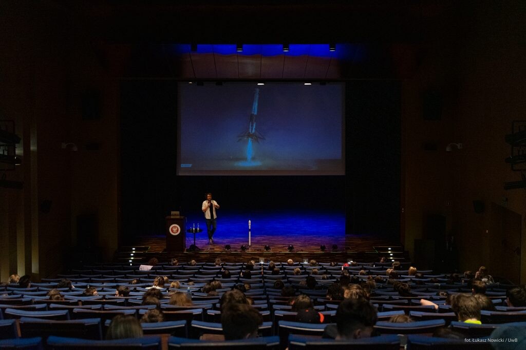 Podczas wykładu w auli Wydziału Nauk o Edukacji UwB uczniowie szkół z Białegostoku i Goniądza oraz pasjonaci astronomii mogli wysłuchać niezwykłych opowieści o czerwonym kabriolecie latającym wokół ziemi, o ludzkości jako gatunku międzyplanetarnym, o „tanich” lotach i rakietach kosmicznych. Nie zabrakło rekwizytów i filmów ilustrujących wykład. Do tego spotkanie było zdecydowanie interaktywne – pytaniom i dialogom pomiędzy prelegentem a widzami nie było końca.