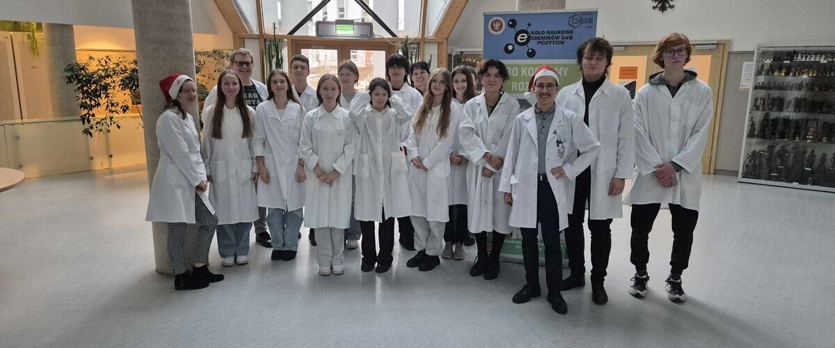 6 grudnia 2024 r. na Wydziale Chemii odbyły się wyjątkowe warsztaty laboratoryjne dla uczniów klas VII–VIII z Niepublicznej Szkoły Podstawowej w Załukach. W zajęciach wzięło udział 12 młodych naukowców, którzy pod okiem ekspertów z Koła Naukowego UwB „Pozyton” (dr Paweł Misiak oraz mgr Jakub Iwaszczuk) mieli okazję przeprowadzić niesamowite eksperymenty! Uczniowie zgłębiali tajniki chemii, wykonując eksperymenty oparte na podstawie programowej. Mieli okazję zapoznać się z pojęciami: