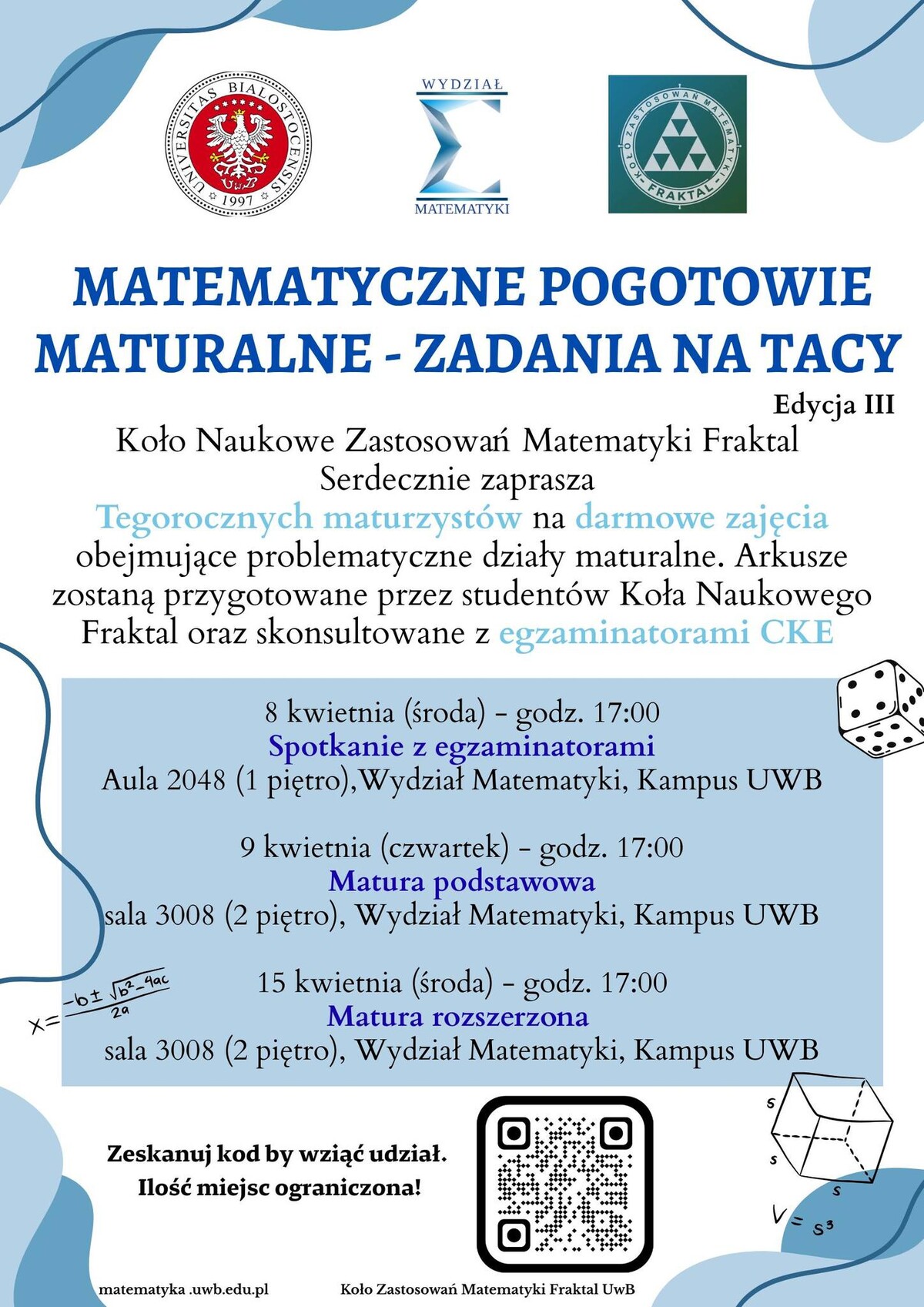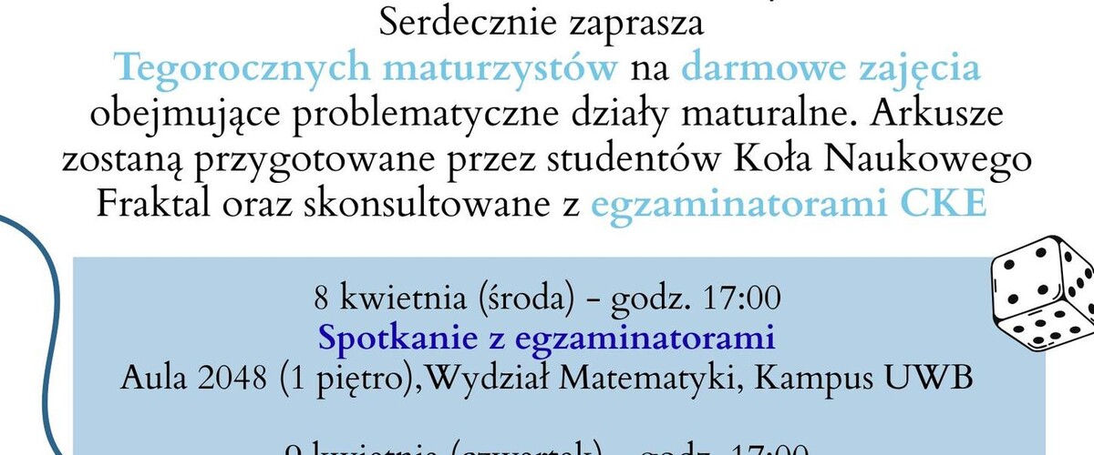 Działające na Wydziale Matematyki UwB Koło Zastosowań Matematyki Fraktal ponownie organizuje „Matematyczne Pogotowie Maturalne – zadania na tacy. Edycja III”. W trakcie trzech spotkań uczniowie będą mieli okazję uporządkować swoją wiedzę, poćwiczyć rozwiązywanie typowych zadań maturalnych, a także dowiedzieć się, na co szczególną uwagę zwracają egzaminatorzy. Zajęcia są bezpłatne.