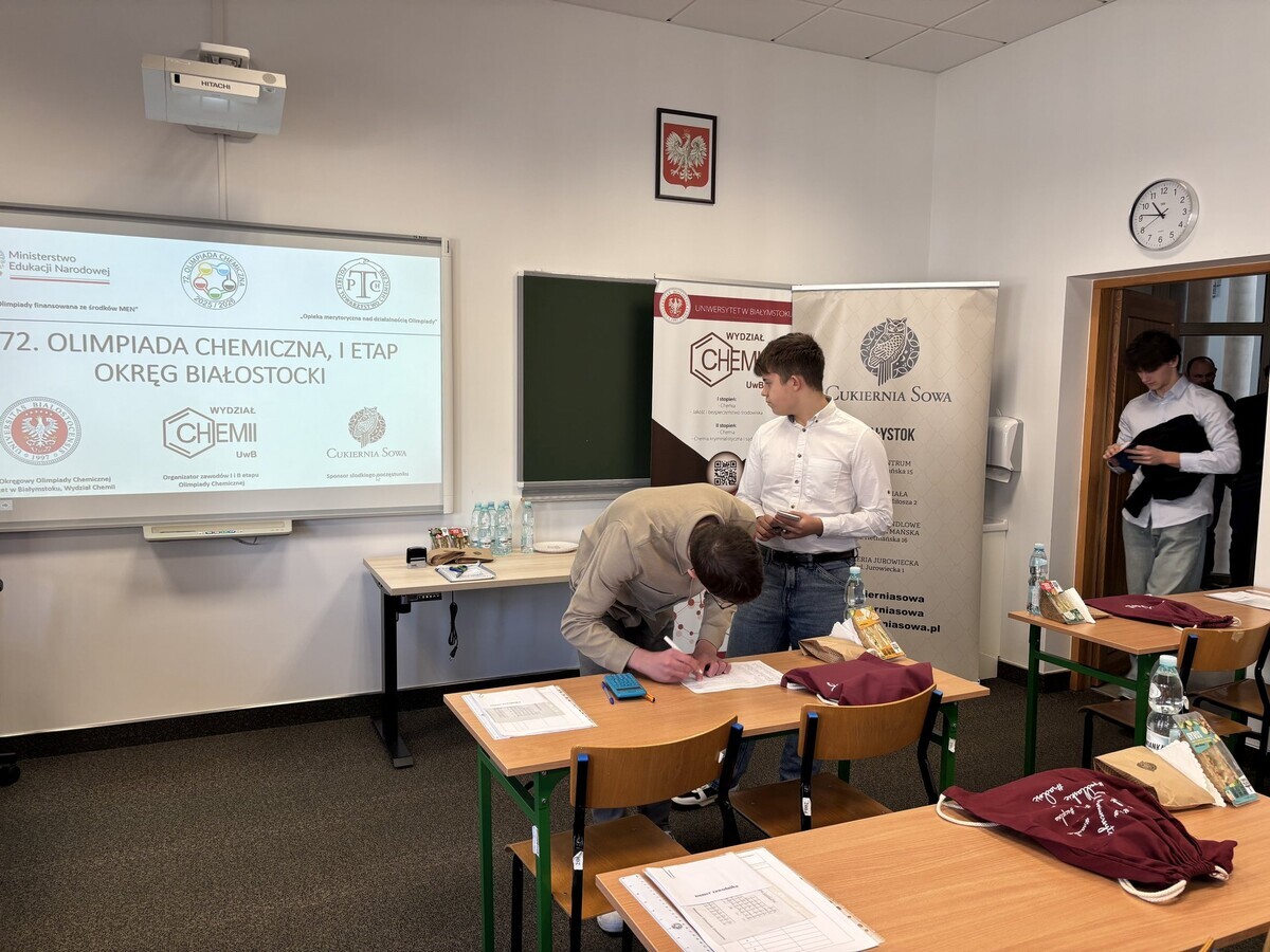 15 listopada 2025 r. na Wydziale Chemii UwB odbył się I etap 72. Olimpiady Chemicznej. Olimpiada Chemiczna to prestiżowy konkurs o zasięgu ogólnopolskim, którego celem jest promowanie wiedzy chemicznej i rozwoju naukowego uzdolnionej młodzieży szkół ponadpodstawowych. Głównym organizatorem jest Polskie Towarzystwo Chemiczne. Wydział Chemii Uniwersytetu w Białymstoku jest współorganizatorem I i II etapu Olimpiady Chemicznej.