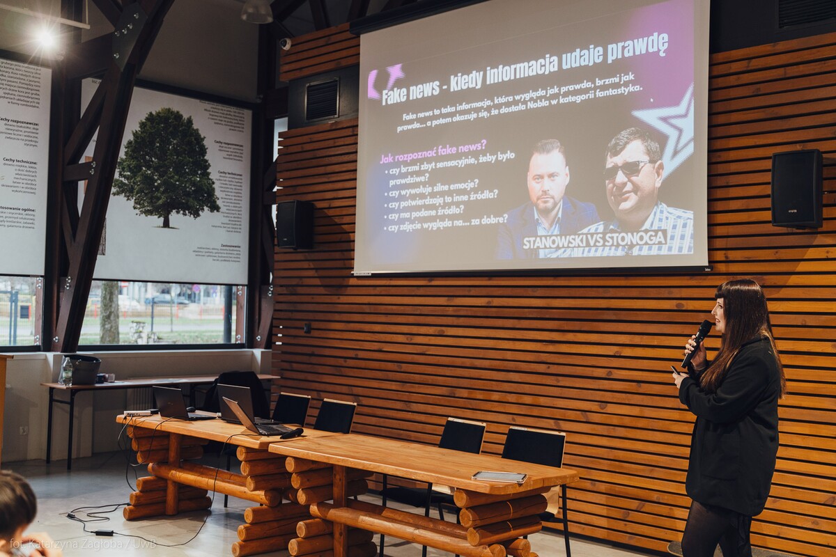 Studentka Wydziału Prawa i członkini Koła Naukowego Stosunków Międzynarodowych Julia Dąbrowska mówiła o współczesnych mediach i ich wpływie na postrzeganie świata, jak rozpoznawać fałszywe treści oraz jakie zagrożenia niesie ze sobą coraz powszechniejsza technologia deepfake. Prelekcja uświadomiła uczestnikom, że krytyczne myślenie jest dziś niezbędną kompetencją.