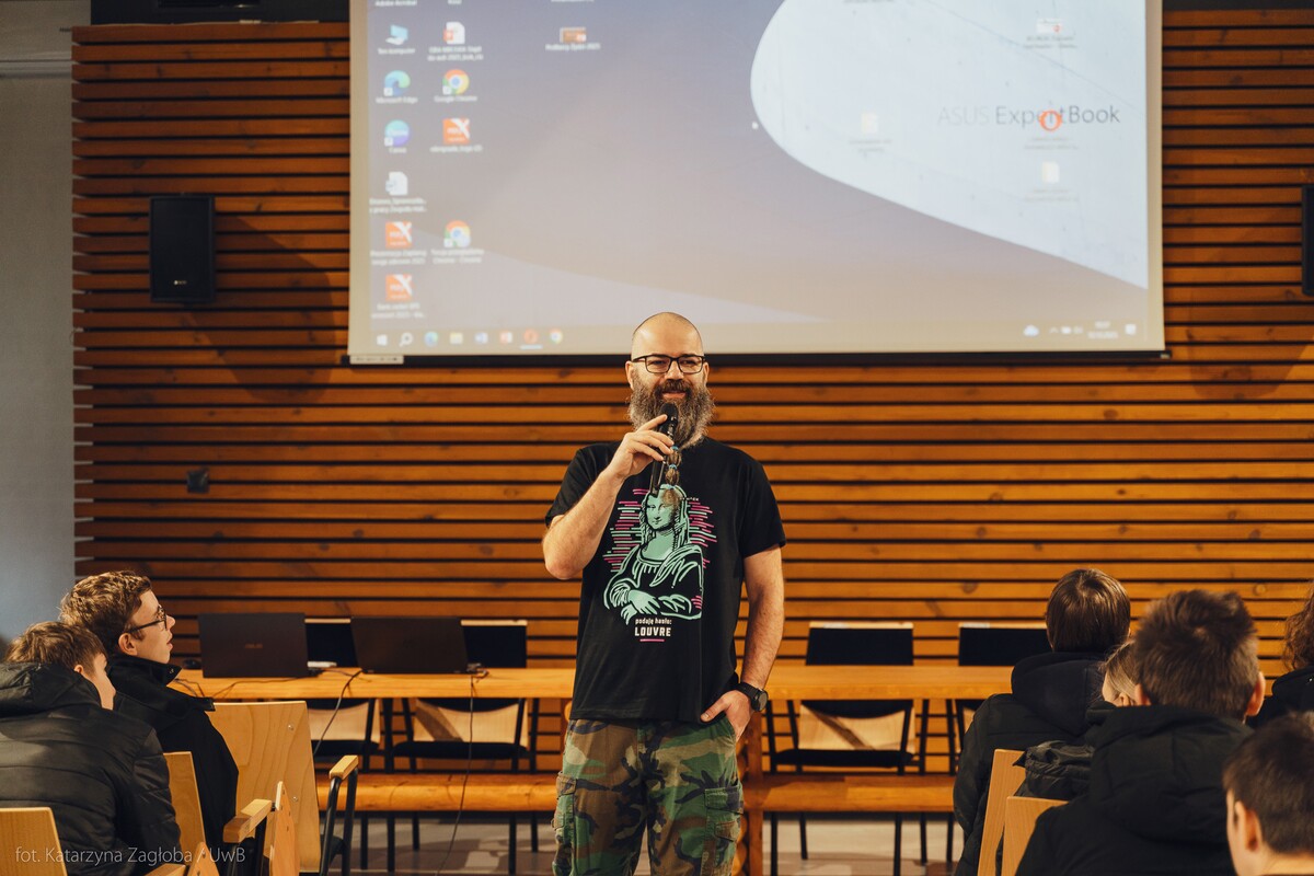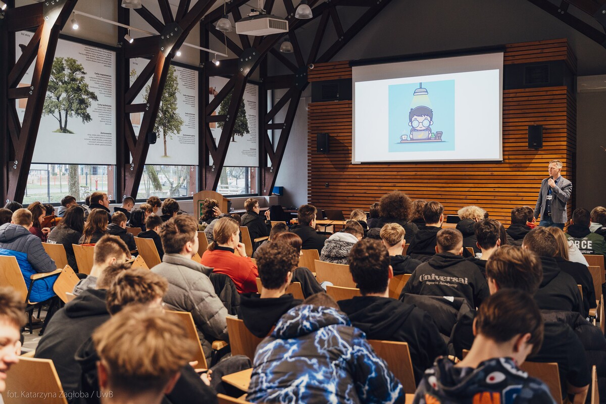 Z kolei Doktor Adam Naumowicz z Wydziału Informatyki opowiadał o przyszłości branży IT, wpływowi sztucznej inteligencji na rynek pracy oraz o tym, jakie kompetencje będą najcenniejsze w nadchodzących latach. Uczniowie uzyskali praktyczną wiedzę na temat realiów pracy informatyka oraz możliwych ścieżek rozwoju.