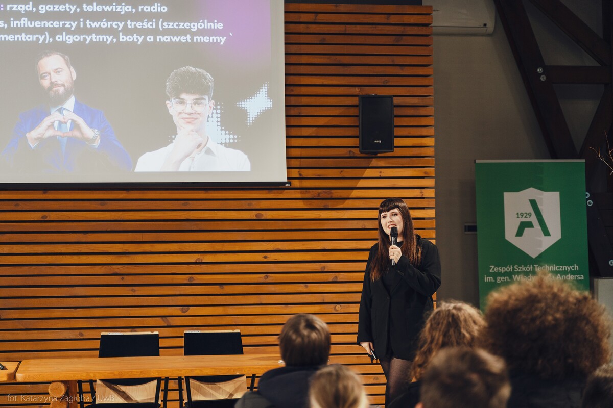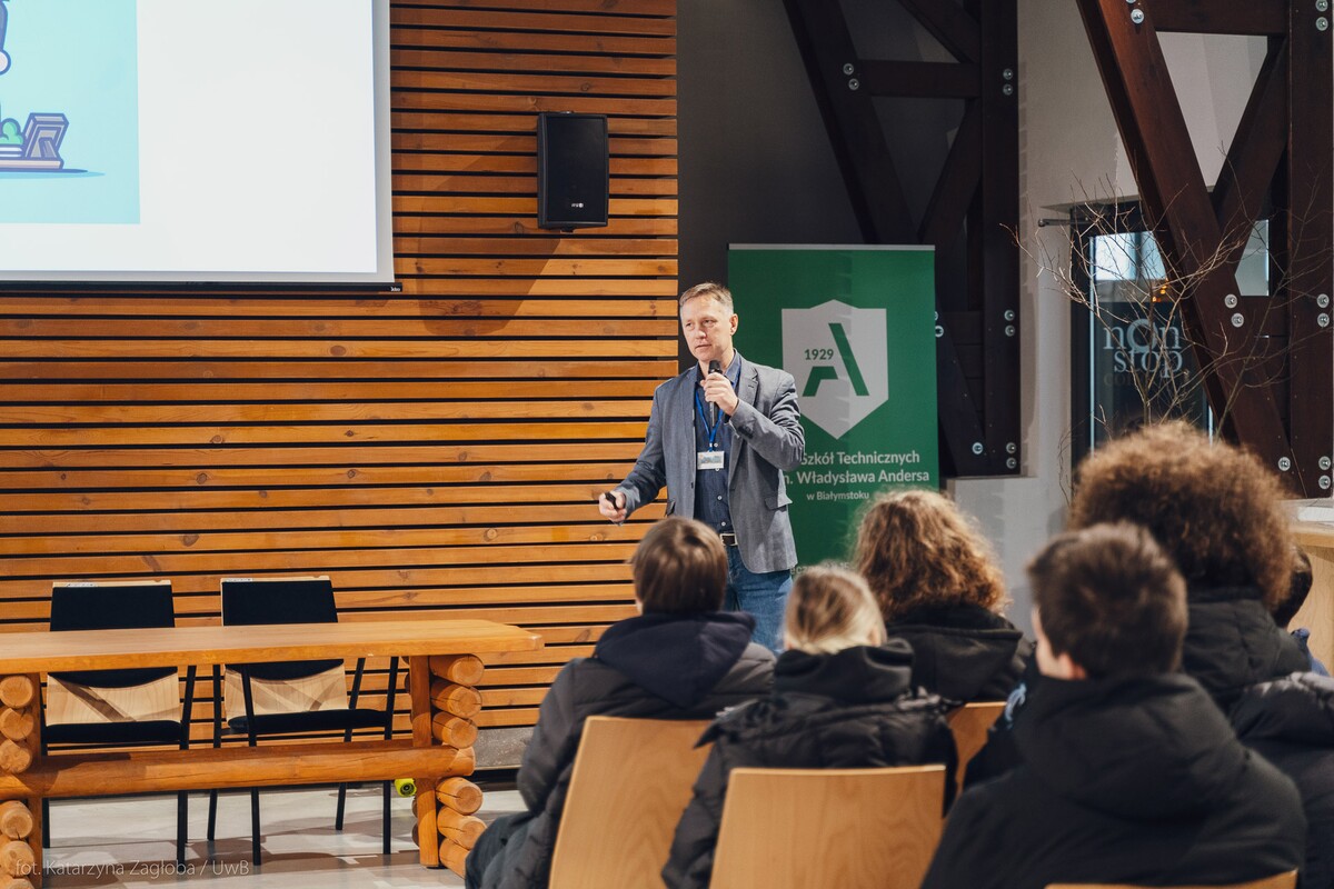 W Zespole Szkół Technicznych im. Gen. Andersa w Białymstoku odbył się cykl zajęć dla uczniów klas drugich, zorganizowany w ramach uniwersyteckiej akcji Studiuj z UwB we współpracy z wykładowcami oraz studentami naszych wydziałów. Spotkanie miało na celu przybliżyć młodzieży aktualne wyzwania związane z technologią, bezpieczeństwem informacyjnym oraz wpływem mediów na kształtowanie opinii publicznej.