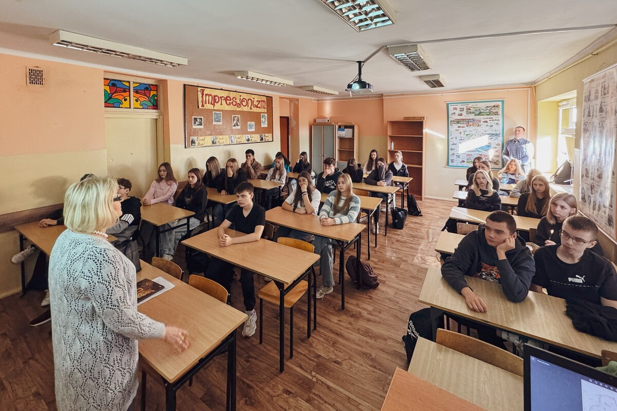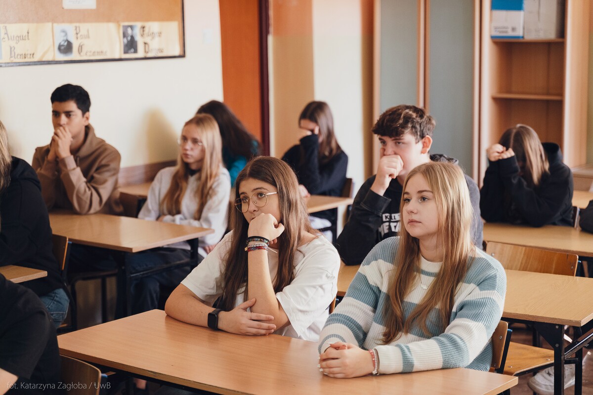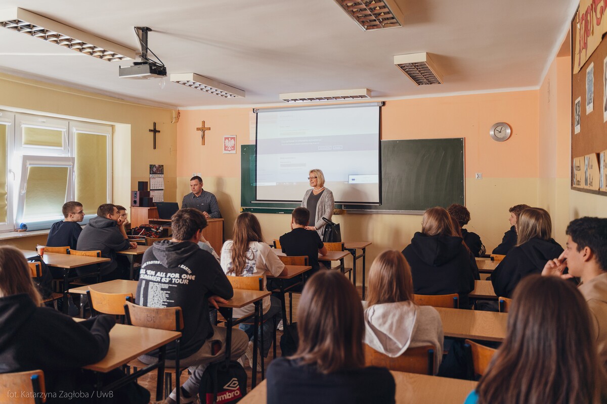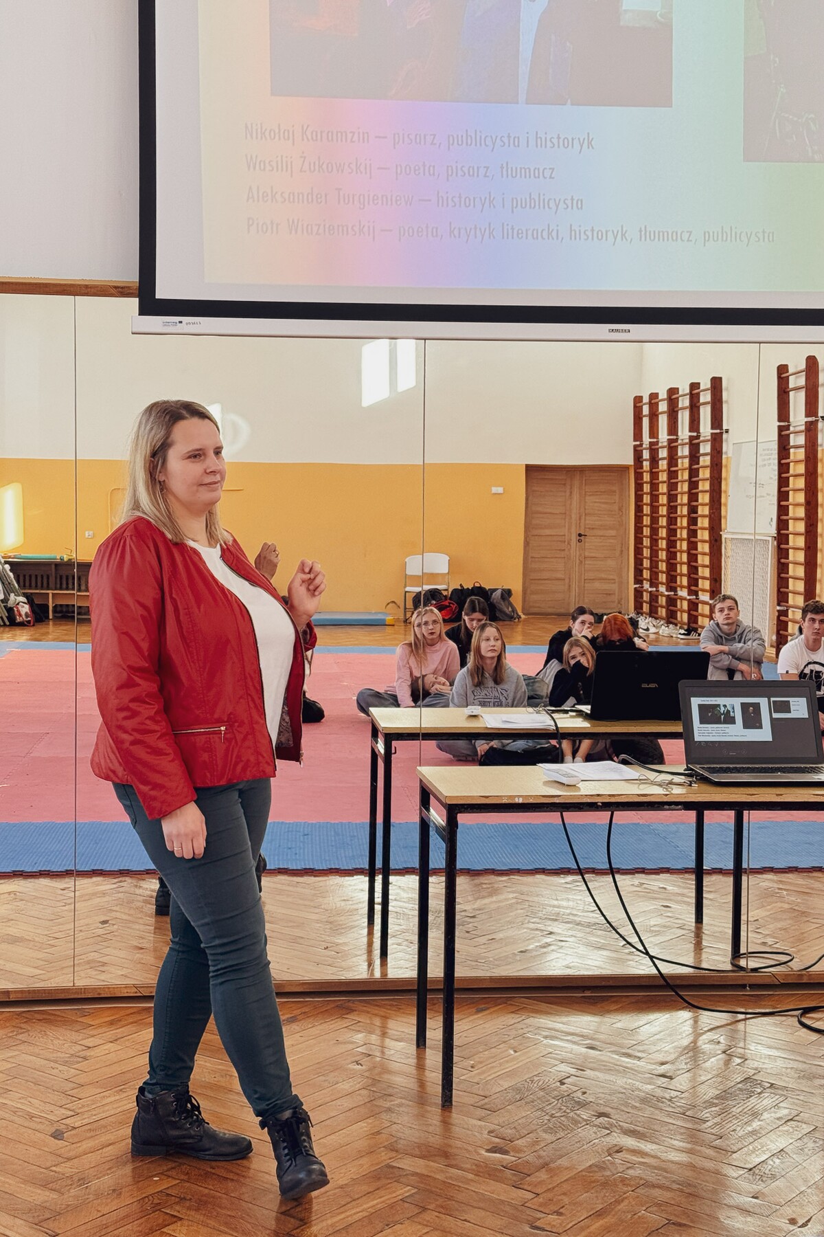 W poniedziałek 4 listopada z młodzieżą spotkały się reprezentantki kadry akademickiej z Wydziału Filologicznego, z Katedry Badań Filologicznych „Wschód-Zachód”, wraz ze studentkami filologii rosyjskiej. O życiu i twórczości klasyki literatury rosyjskiej Aleksandra Puszkina rozmawiały z młodzieżą dr Anna Alsztyniuk oraz dr hab. Anna Sakowicz. O zwyczajach, obrzędach oraz wschodniosłowiańskim nazewnictwie związanym z Wigilią Bożego Narodzenia w gwarach Białostocczyzny opowiadała dr Nina Raczkiewicz. Do interaktywnych zajęć sprawdzających znajomość języka rosyjskiego zaprosiła młodzież dr Olga Anchimiuk. Uczniowie mieli okazję w praktyce sprawdzić swoje umiejętności językowe w quizach i grach integracyjnych. Na koniec dwie studentki filologii rosyjskiej, Sylwia Radziwon oraz Paula Krzywicka, opowiedziały o studiowaniu na Uniwersytecie w Białymstoku oraz o możliwościach, jakie proponuje uczelnia przyszłym studentom.