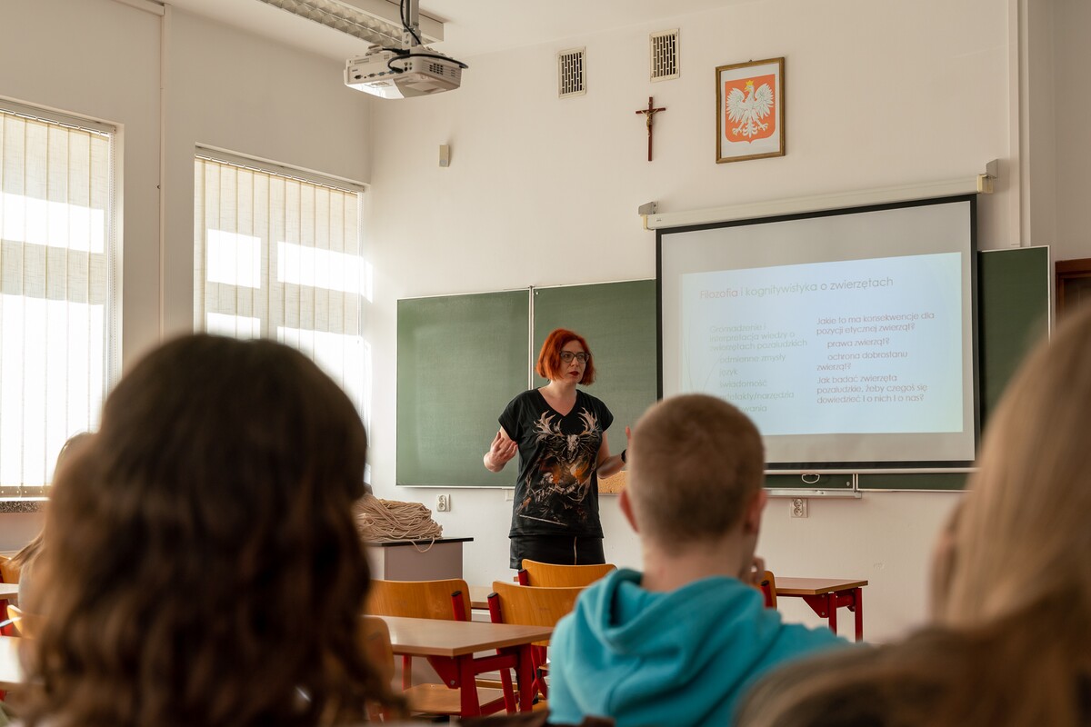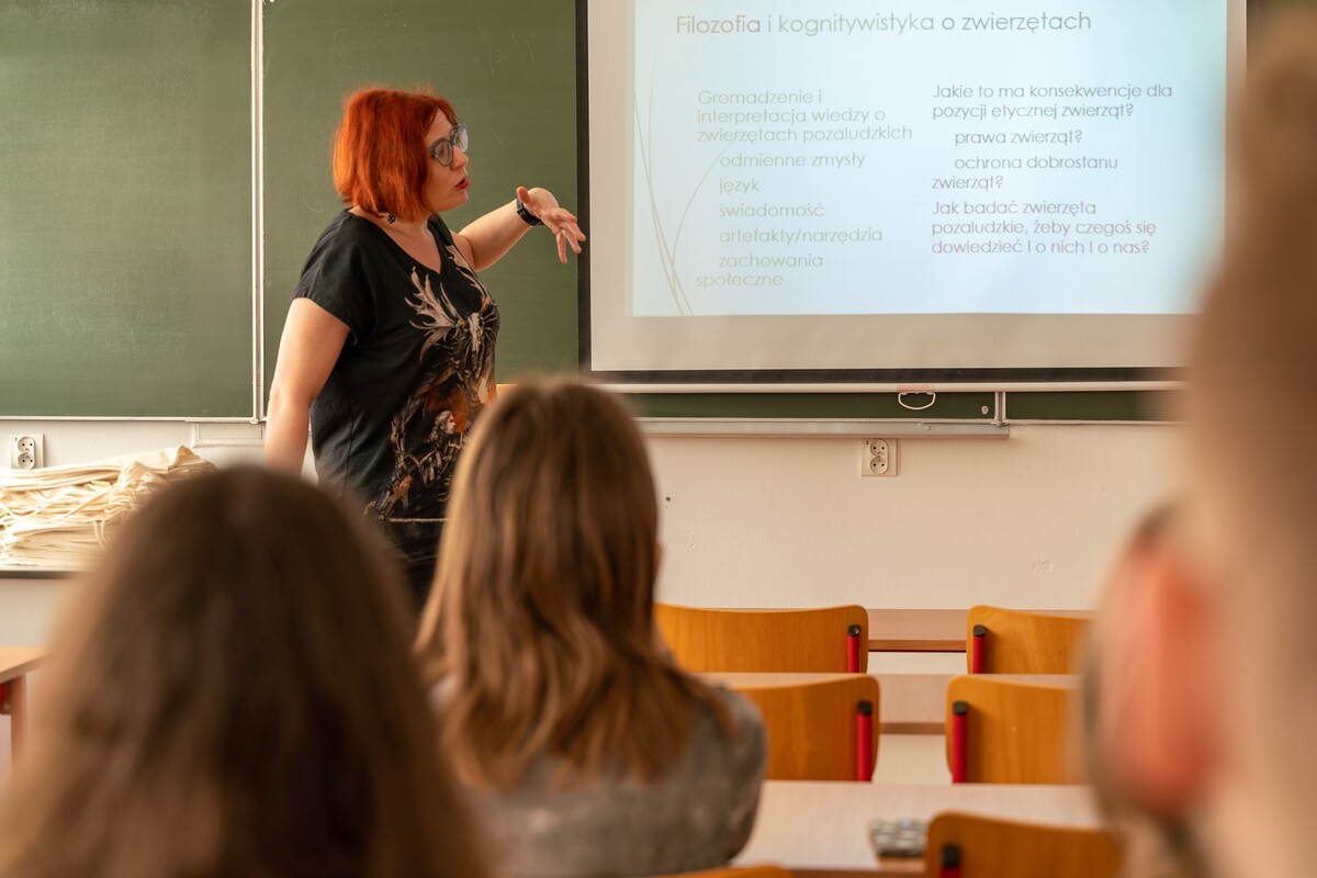 Na warsztatach z dr Mają Białek z Instytutu Filozofii uczniowie mogli dowiedzieć się m.in. czy zwierzęta inne niż człowiek czują, myślą, doznają emocji.