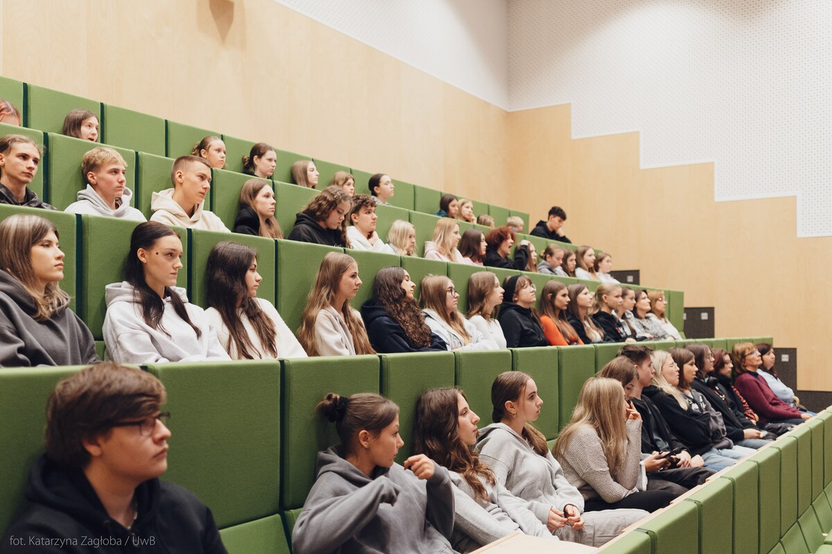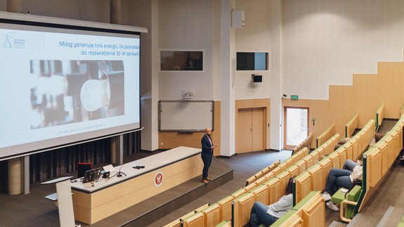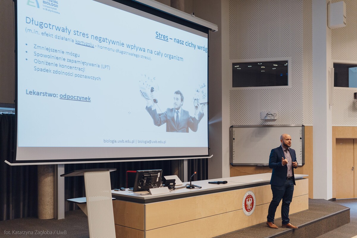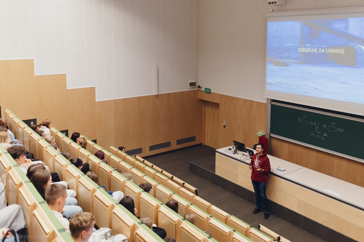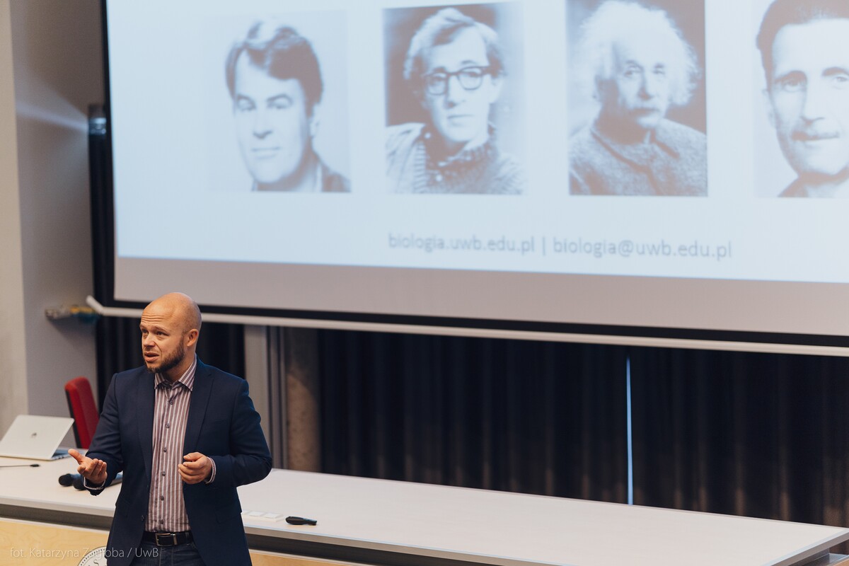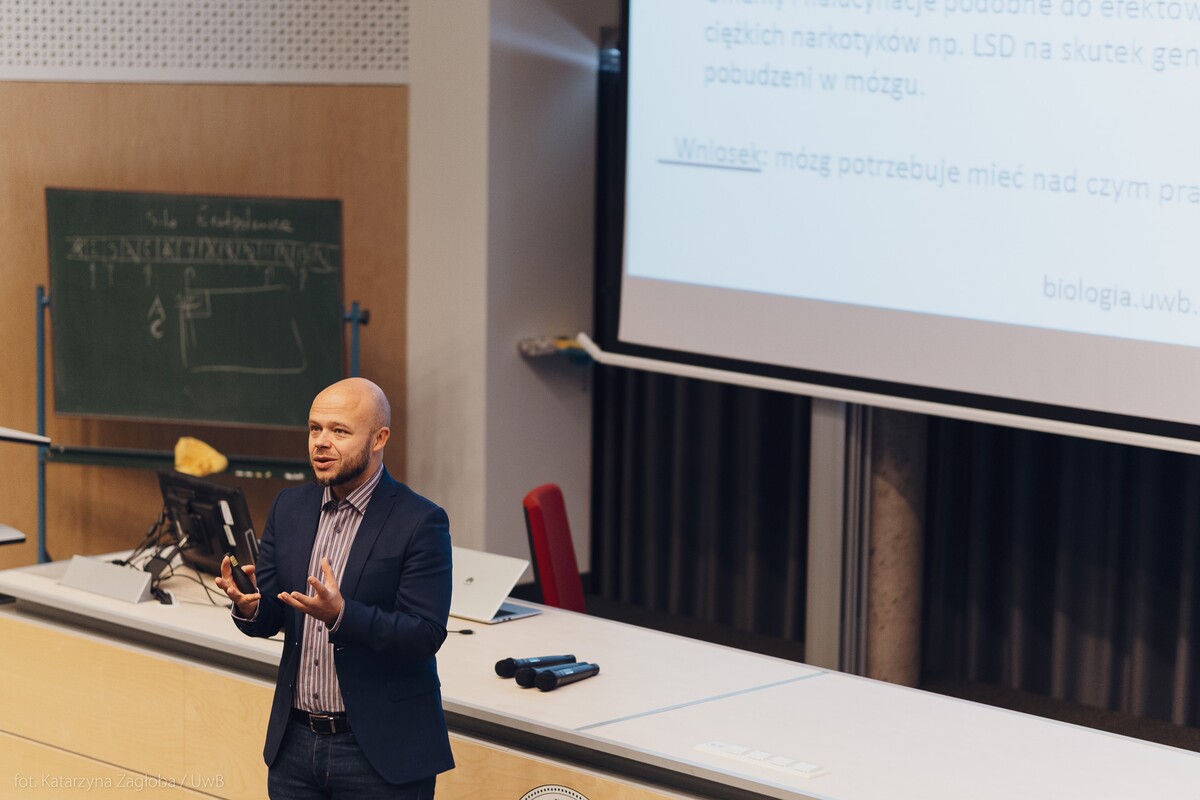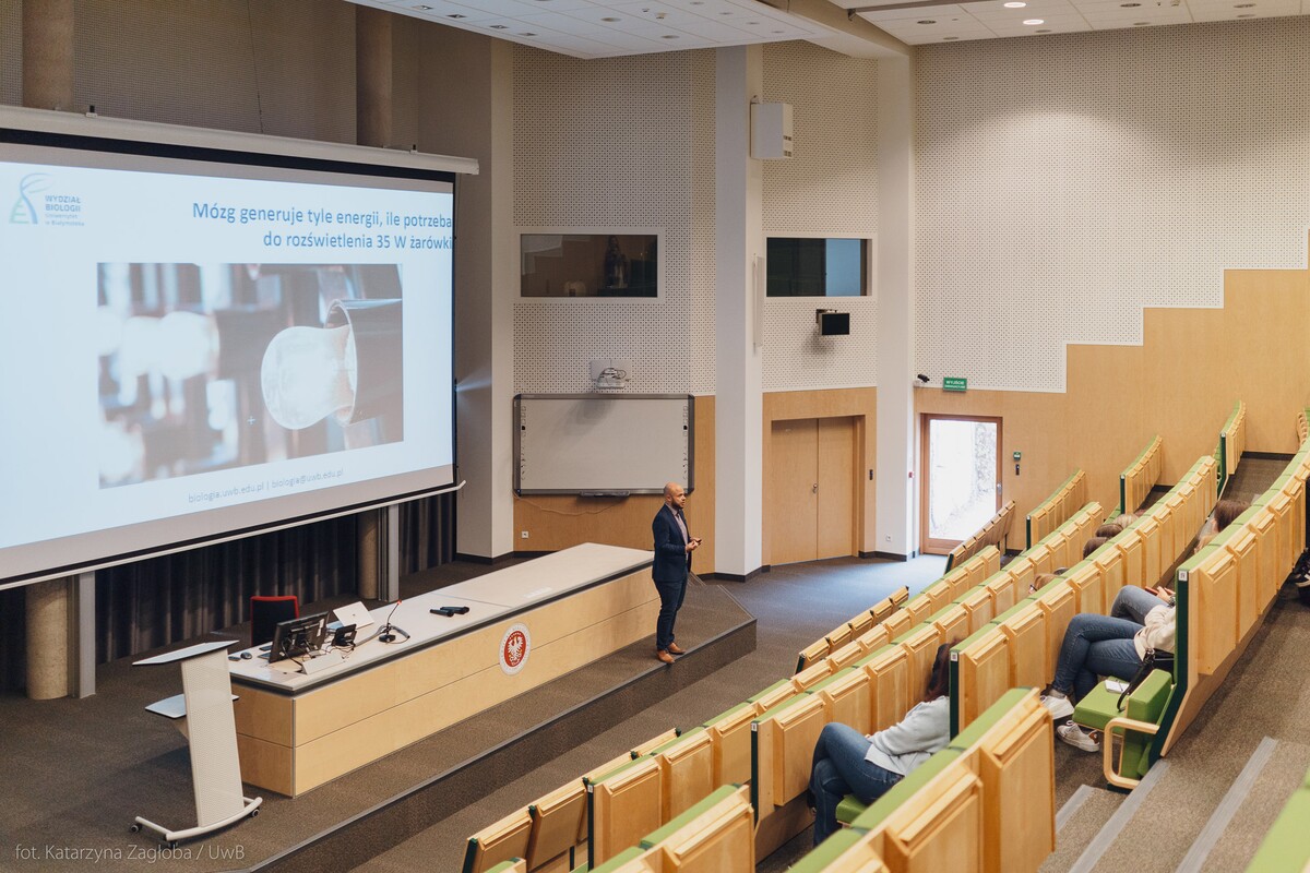 Z kolei dr Marek Bartoszewicz z Wydziału Biologii, prodziekan ds. studenckich i rozwoju, zaprosił młodzież na wykład pn.”Tajemnice ludzkiego mózgu”, na którym uczniowie dowiedzieli się o wielu faktach i mitach z zakresu neurobiologii. Dr Bartoszewicz wyjaśniał, w jaki sposób się uczymy, dlaczego musimy spać oraz jak rodzą się wspomnienia i marzenia. Nie zabrakło ciekawostek dotyczących budowy i działania układu nerwowego. Młodzież lepiej zrozumiała jak skomplikowaną strukturą jest mózg. W ramach wykładu przedstawione zostały przykłady neuroodmienności, m.in. zagadnienia dotyczące osób z zespołem Aspergera. Na koniec wykładu uczniowie dowiedzieli się jakie są konkretne sposoby skutecznego uczenia się.