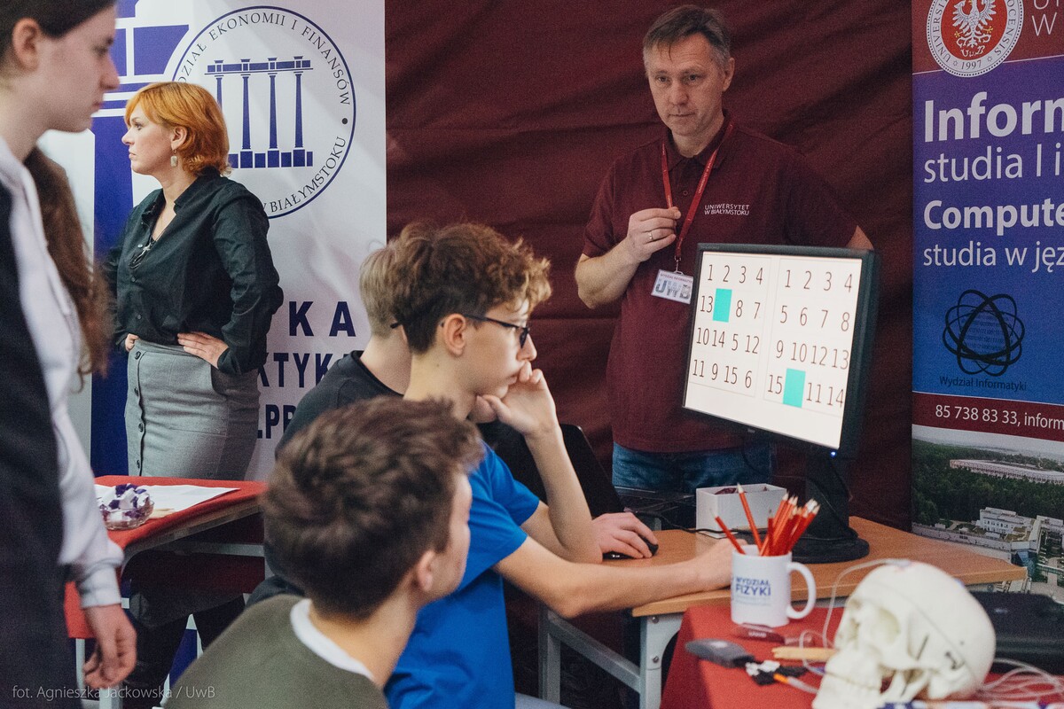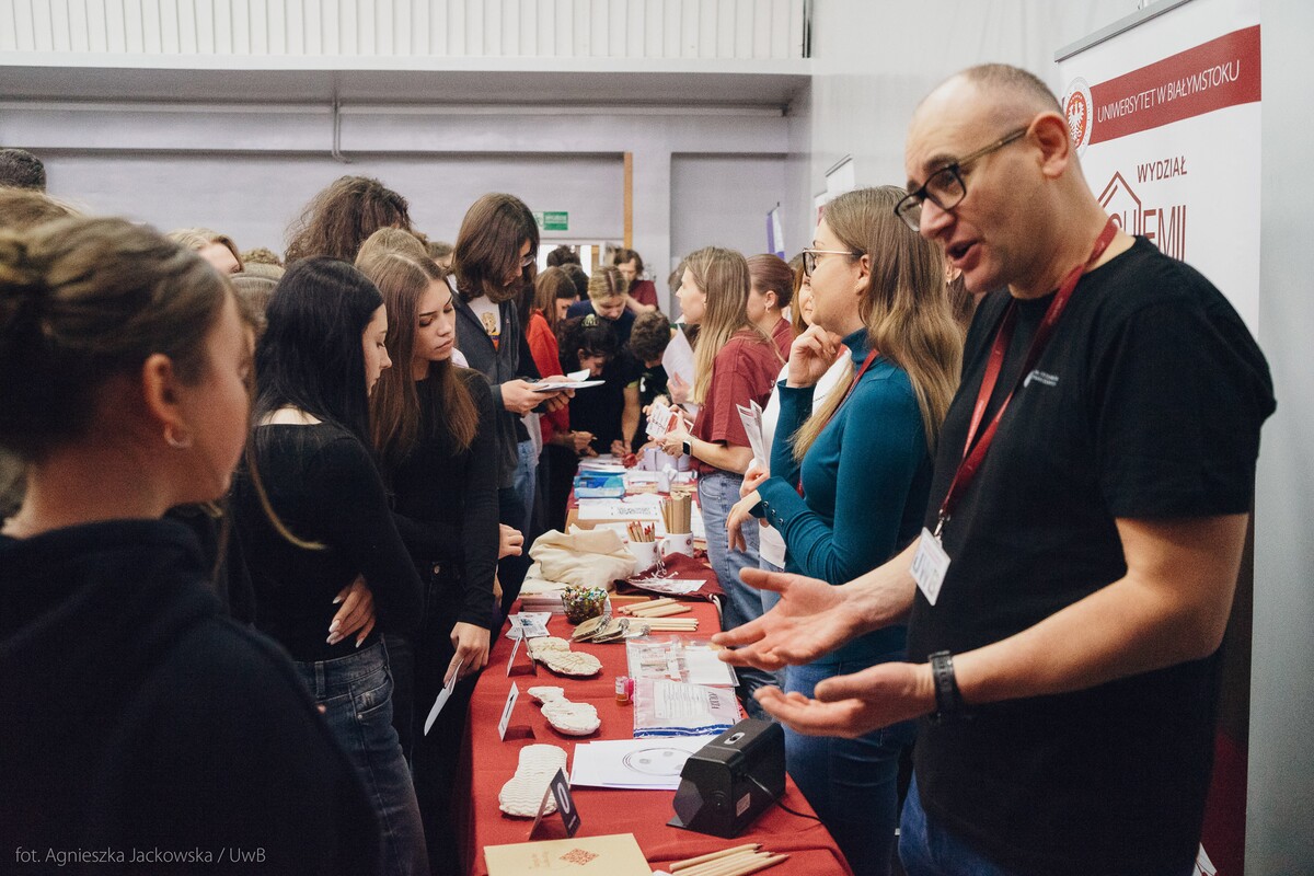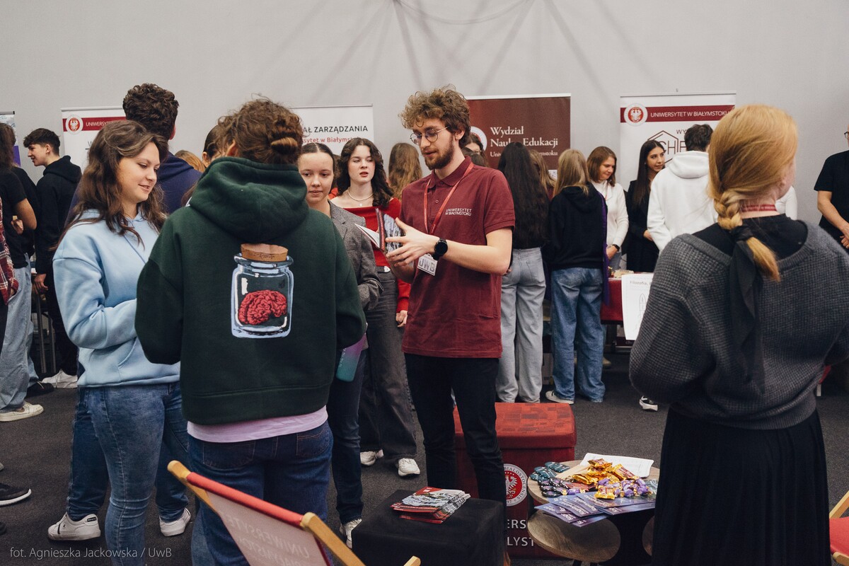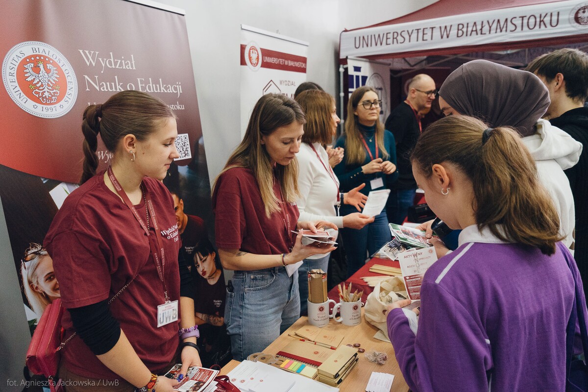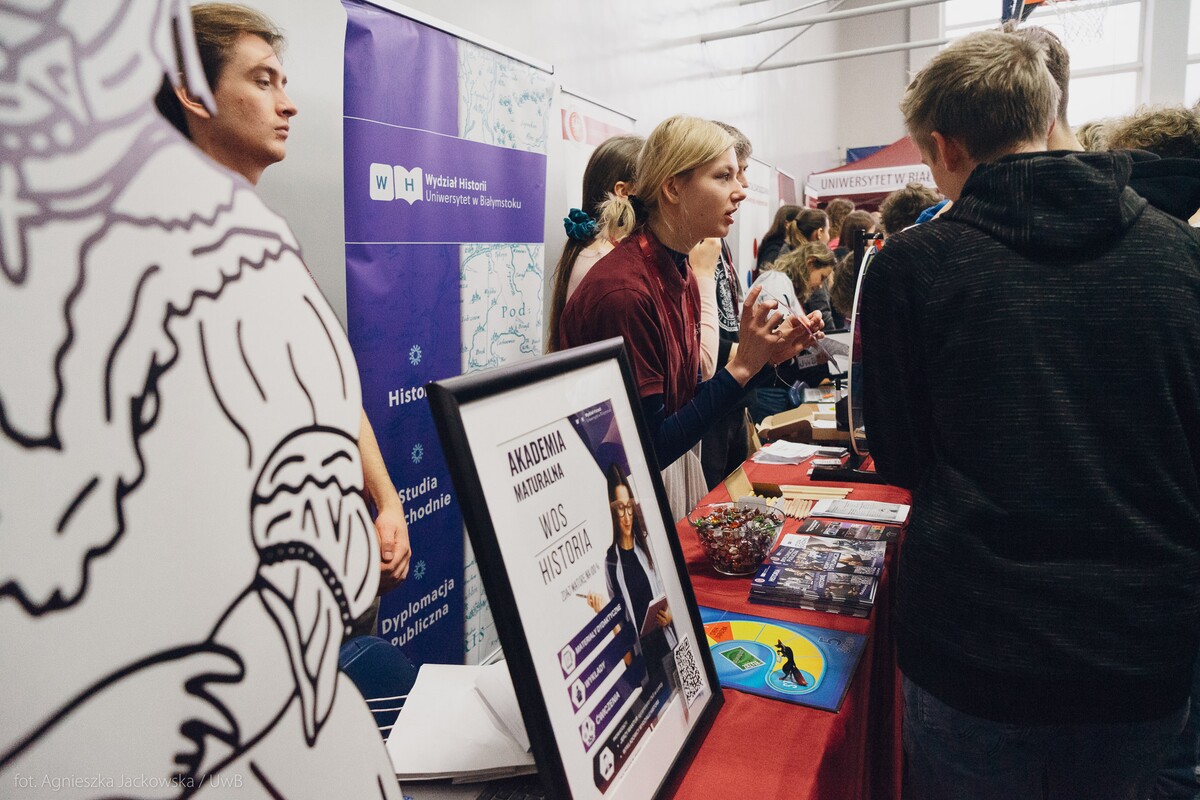 Wiele pytań, angażujących rozmów, interakcji. W czwartek, 23 stycznia reprezentanci 13 wydziałów Uniwersytetu w Białymstoku oraz Uniwersyteckiego Centrum Rekrutacji spotkali się z uczniami II LO im. Księżnej Anny z Sapiehów Jabłonowskiej w Białymstoku. Nasze stoisko cieszyło się olbrzymim zainteresowaniem. Uczniowie zadawali mnóstwo pytań, chętnie rozmawiali z naszymi studentami, brali też udział w aktywnościach, które przygotowały wydziały. W ofercie UwB były też ciekawe wykłady, które przyciągnęły tłumy młodych ludzi. Z Wydziału Historii zaprezentowali się: dr Tomasz Wesołowski w wykładzie pt. „ Wartość życia żołnierza: straty Armii Czerwonej w II Wojnie Światowej” oraz mgr Paweł Gawryluk i mgr Justyna Sikorska w warsztacie pt. Fejkoodporni – jak zbudować odporność na dezinformację?”. Młodzież wzięła udział w warsztacie dotyczącym zmiany imienia i nazwiska mgr Sylwii Łazuk – Baranowskiej pn.”Czy mogę nazywać się jak ktoś sławny?”. O dezinformacji opowiadał dr hab. Daniel Boćkowski, prof. UwB z Wydziału Stosunków Międzynarodowych, o współpracy i pracy zespołowej mówił dr Mariusz Citkowski z Wydziału Zarządzania. Wydział Fizyki reprezentował dr Łukasz Łabieniec. Opowiadał licealistom o sile nauki w leczeniu i diagnostyce oraz możliwościach, jakie dają studia fizyki medycznej.