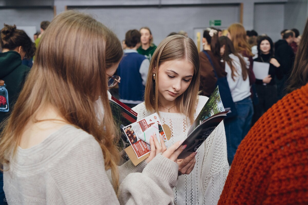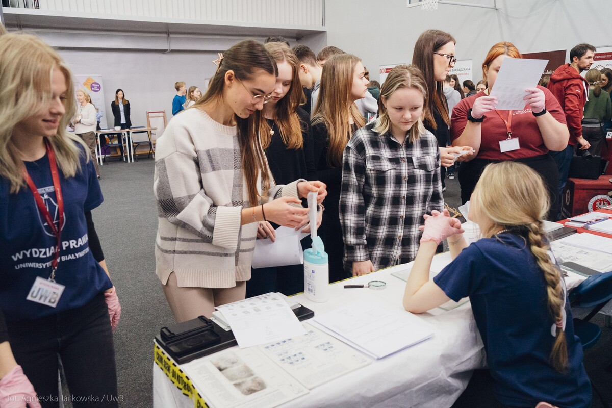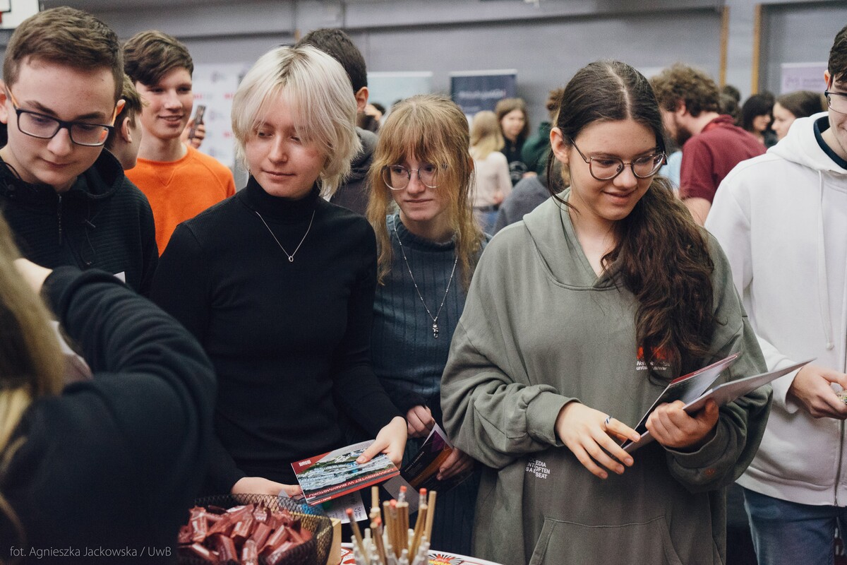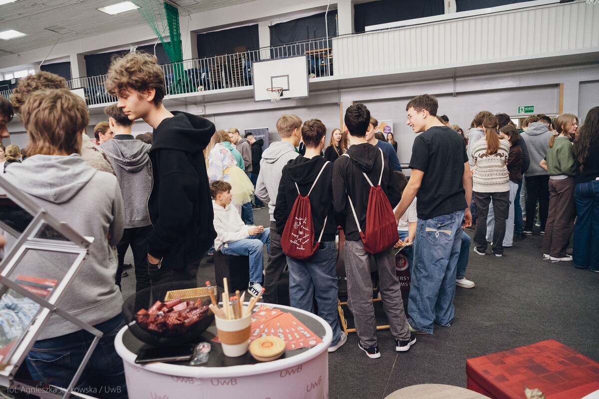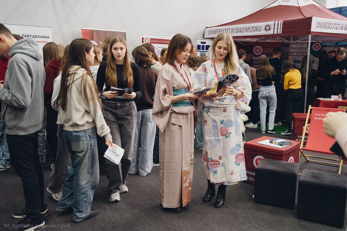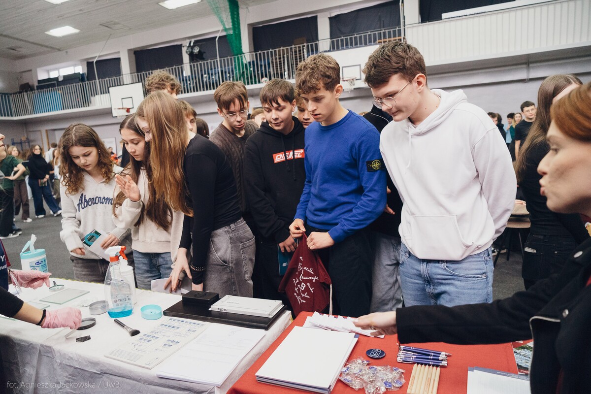 Wiele pytań, angażujących rozmów, interakcji. W czwartek, 23 stycznia reprezentanci 13 wydziałów Uniwersytetu w Białymstoku oraz Uniwersyteckiego Centrum Rekrutacji spotkali się z uczniami II LO im. Księżnej Anny z Sapiehów Jabłonowskiej w Białymstoku. Nasze stoisko cieszyło się olbrzymim zainteresowaniem. Uczniowie zadawali mnóstwo pytań, chętnie rozmawiali z naszymi studentami, brali też udział w aktywnościach, które przygotowały wydziały. W ofercie UwB były też ciekawe wykłady, które przyciągnęły tłumy młodych ludzi. Z Wydziału Historii zaprezentowali się: dr Tomasz Wesołowski w wykładzie pt. „ Wartość życia żołnierza: straty Armii Czerwonej w II Wojnie Światowej” oraz mgr Paweł Gawryluk i mgr Justyna Sikorska w warsztacie pt. Fejkoodporni – jak zbudować odporność na dezinformację?”. Młodzież wzięła udział w warsztacie dotyczącym zmiany imienia i nazwiska mgr Sylwii Łazuk – Baranowskiej pn.”Czy mogę nazywać się jak ktoś sławny?”. O dezinformacji opowiadał dr hab. Daniel Boćkowski, prof. UwB z Wydziału Stosunków Międzynarodowych, o współpracy i pracy zespołowej mówił dr Mariusz Citkowski z Wydziału Zarządzania. Wydział Fizyki reprezentował dr Łukasz Łabieniec. Opowiadał licealistom o sile nauki w leczeniu i diagnostyce oraz możliwościach, jakie dają studia fizyki medycznej.