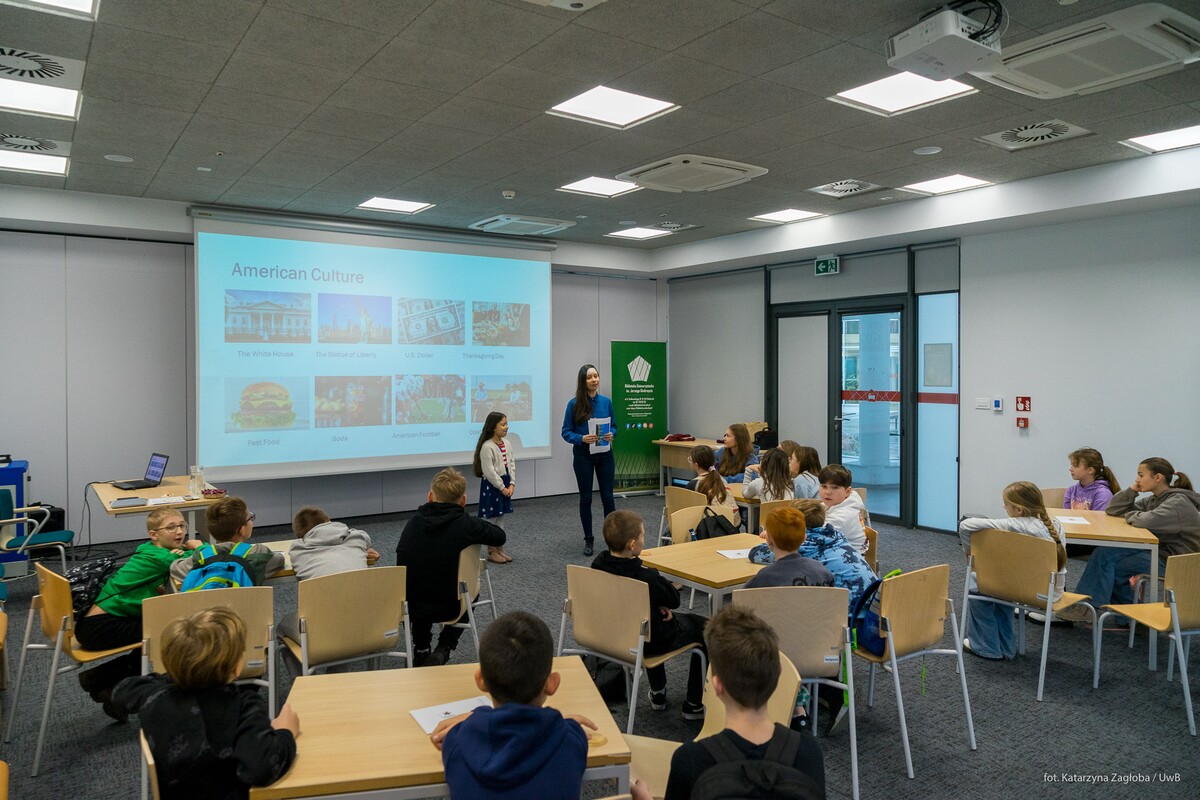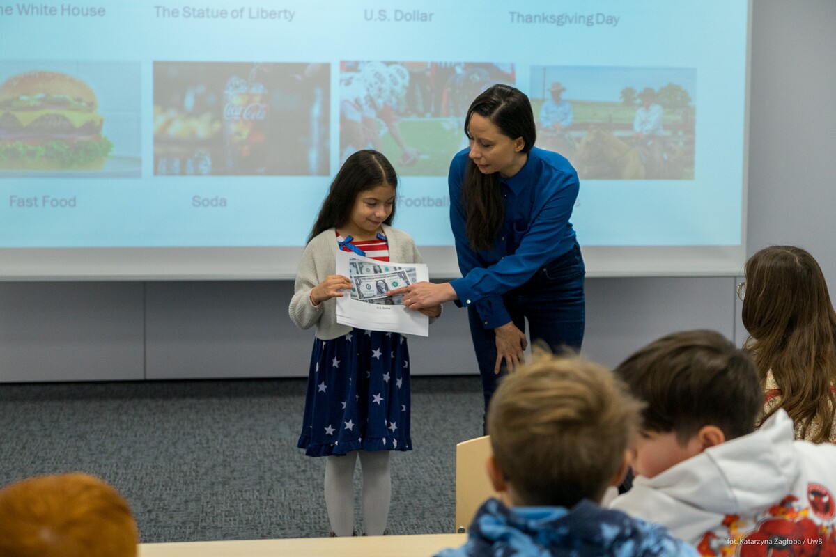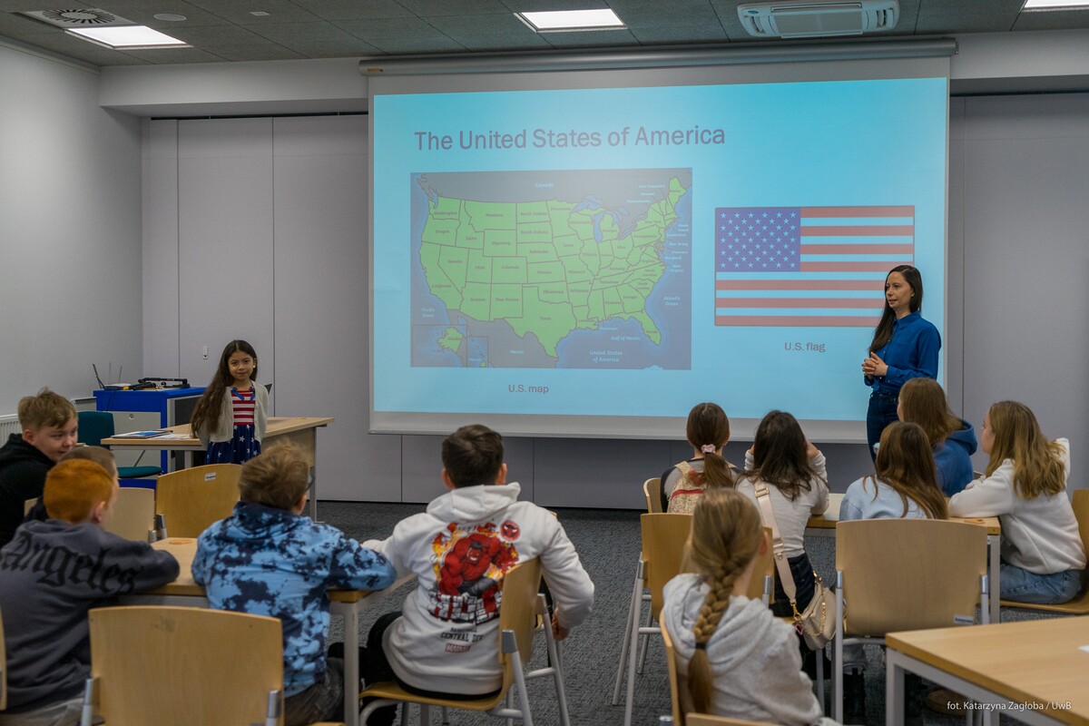 „Kultura i język w USA” to tytuł zajęć interaktywnych, które przeprowadziła dr Anna Sańczyk-Cruz z Wydziału Filologicznego wraz z córką Gabrysią Cruz (native speakerka). To była świetna okazja do zainspirowania młodych uczniów nauką języków obcych. Nie zabrakło ciekawostek zarówno językowych, jak i kulturowych USA.
